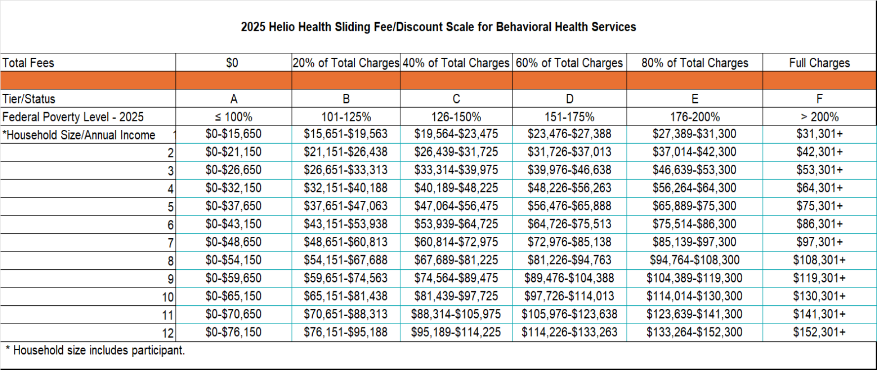 Helio Health offers a Sliding Fee Discount Program to all who are unable to pay for their services. Helio Health will base program eligibility on a person’s ability to pay and will not discriminate on the basis of an individual’s race, color, sex, national origin, disability, religion, age, sexual orientation, or gender identity. The Federal Poverty Guidelines (FPG) are used in creating, and annually updating, the sliding fee schedule (SFS) to determine eligibility. (See chart below for our current Sliding Fee Discount Rates.)